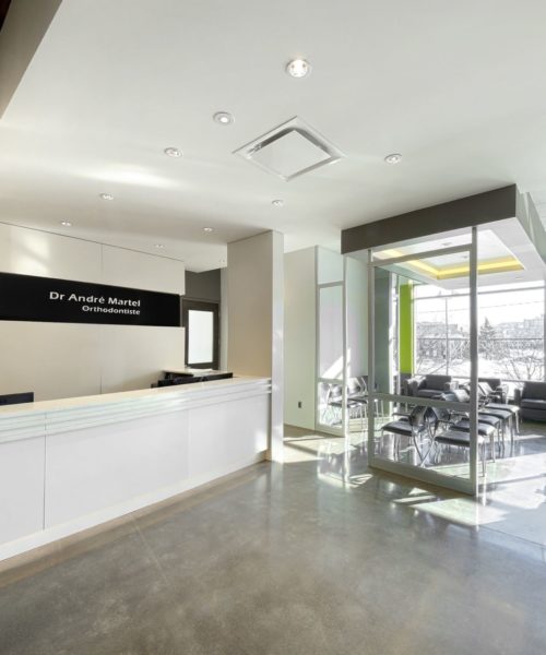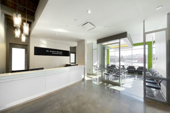 Nous avions à aménager un espace de 3495 pi2, à l’intérieur d’un nouvel édifice du centre-ville de Chicoutimi. De facture contemporaine, le blanc domine dans tous les espaces et est ponctué par quelques accents de vert. Les matériaux sélectionnés pour la réalisation du mobilier sont intemporels tout en nécessitant un minimum d’entretien. Les espaces de traitement sont situés devant de grandes baies vitrées qui favorisent un apport lumineux naturel maximal.