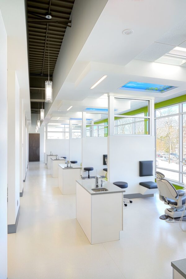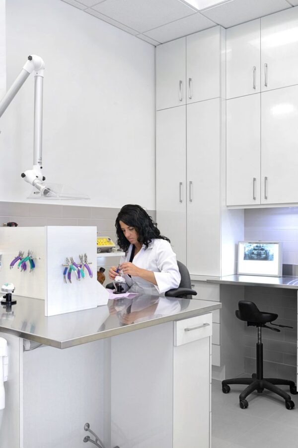 La demande incluait également des plans d’exécutions pour la réalisation du projet et un conception de mobiliers intégrés ayant des fonctionnalités très spécifiques qui permettent aux professionnels de réaliser des tâches précises de façon logique et ergonomique.