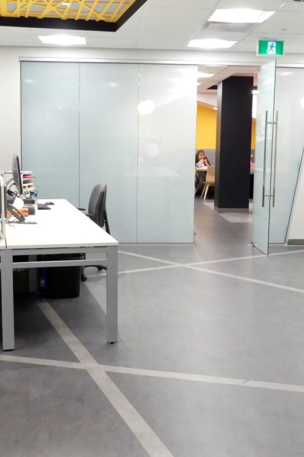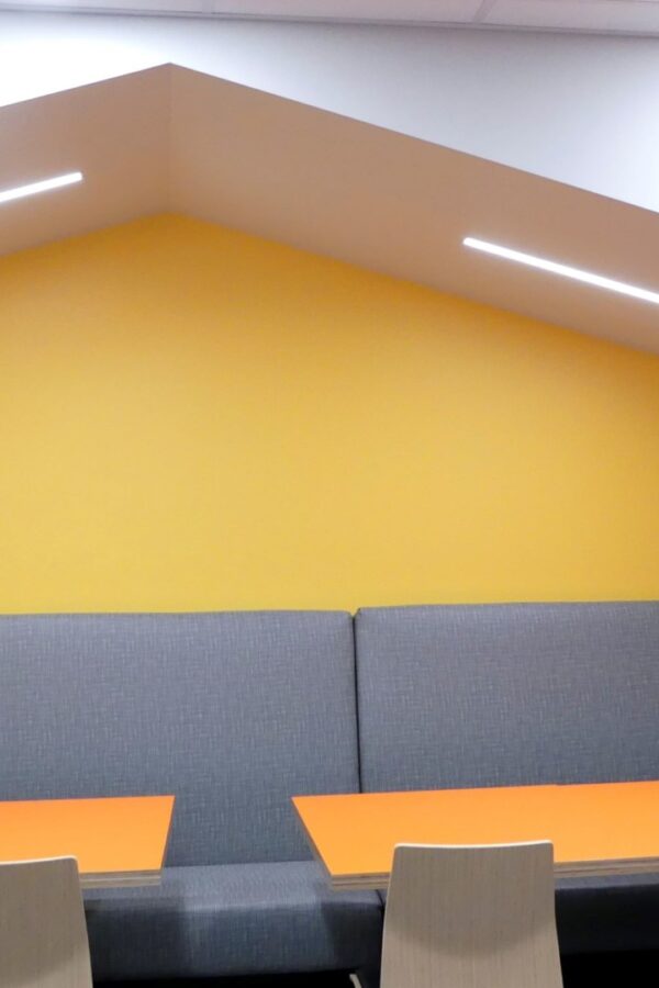 Le revêtement de sol souple est entrecoupé de lignes franches qui créent un jeu d’ondes se réverbérant, à une échelle différente, sur le plafond fait de feutre acoustique.