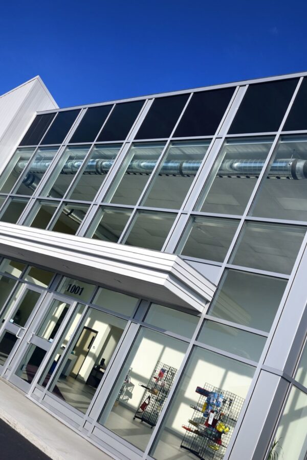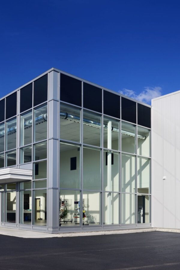 Nous y sommes parvenus en alliant une construction en bois, un revêtement d’acier, une toiture à membrane et une vitrine sur une partie de la façade. Celle-ci captive par sa transparence et permet une belle luminosité aux différents étages.